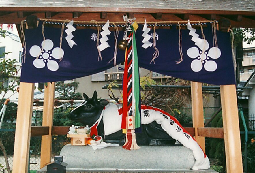 地元では「大利神社」とも呼ばれ、地域の人々に長く親しまれています。創建年代は不詳ながら、江戸時代の貞享3年(1686年)の記録にもその存在が記されており、古くからこの地を見守ってきた由緒ある神社です。御祭神には、大歳神・菅原道真公・大国主大神・事代主大神が祀られています。鳥居には「大利神社」と刻まれた扁額と大きな注連縄が掲げられ、境内に入ると菅原道真公の神使である「撫で牛」が出迎えてくれます。