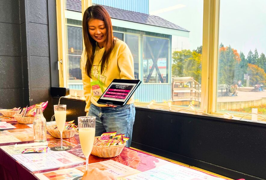 「天空スナック」は前日までの悪天候の影響で、急遽ロープウェイ乗り場付近の室内での開催に変更。それでも標高1,000mの空気と紅葉の絶景を背景に、参加者は特製モクテル「雪色ゴールドスパークル」を片手に乾杯。