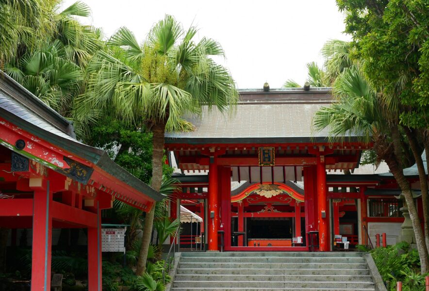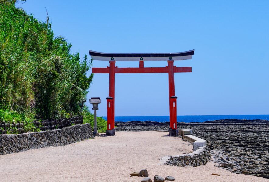 青島神社:歩いて渡れる島内には南国の植物が広がり、中心には神話が息づく神社が静かに佇みます。