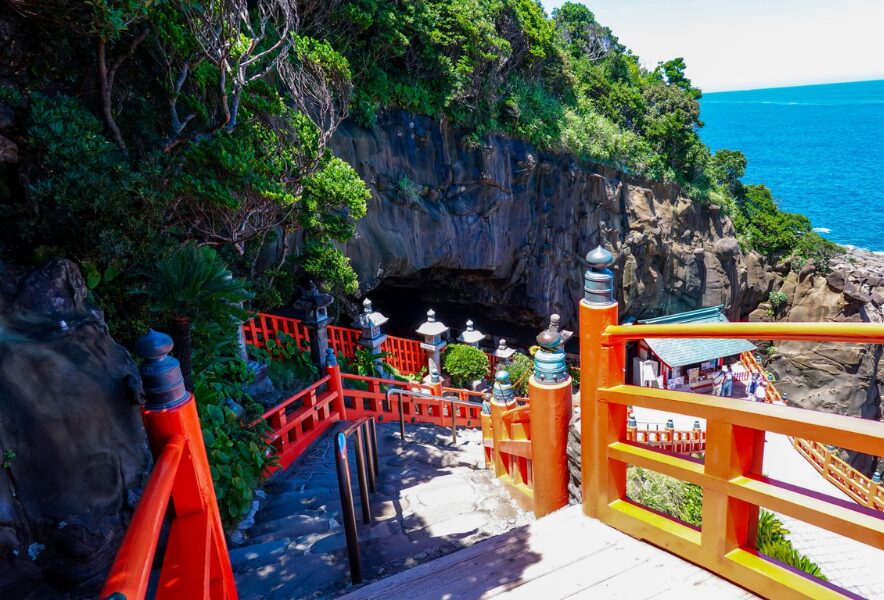 鵜戸神宮(日南市):宮崎県日南市大字宮浦3232——青い海と断崖の先に現れる、朱色が印象的な神秘の社。坂を下ってたどり着く境内は、訪れた瞬間から非日常の空気に包まれます。眼下には荒々しい岩と海が広がり、願いを込めて投げる運玉でも知られる特別な場所。洞窟の中に溶け込むように佇む社殿は、自然と信仰が一体となった圧倒的な景観を生み出しています。——海・岩・朱色が織りなすコントラスト。宮崎で“神話と自然の力”を体感できる、忘れられないスポットです。