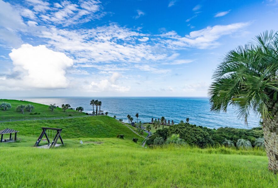 サンメッセ日南(日南市):宮崎県日南市大字宮浦2650——海・空・緑、そしてモアイ。宮崎で一気に旅気分が高まる、インパクト抜群のスポットです。
