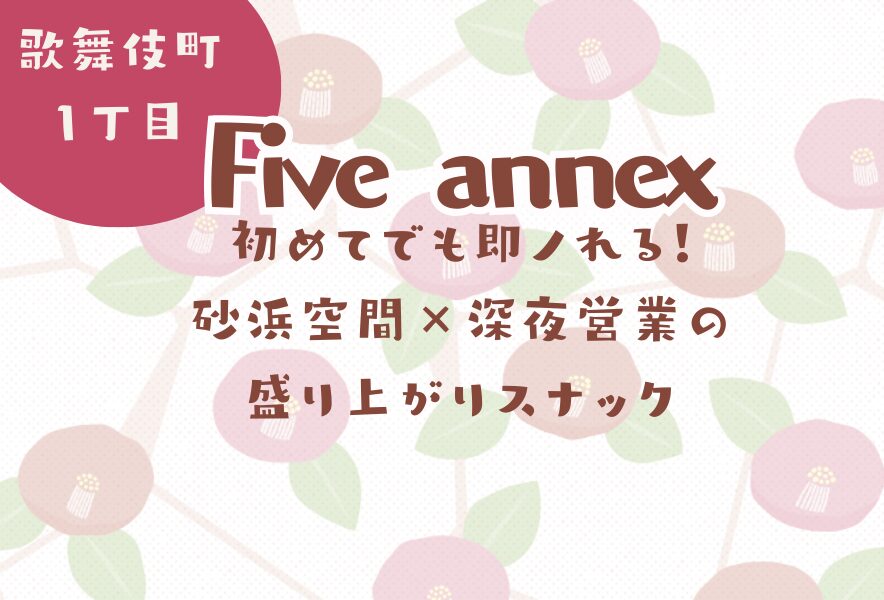 | 【歌舞伎町1丁目:Five annex】初めてでも即ノれる!砂浜空間×深夜営業の盛り上がりスナック | |